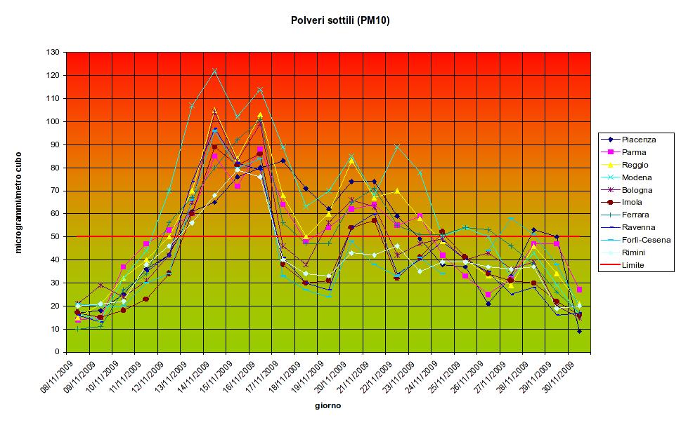 Le polveri di novembre 2009 in Emilia Romagna (PM10) così come fornite dall’Arpa nel sito Liberiamo l’Aria e da noi raccolte in un grafico evidenziano la situazione di picco verificatasi tra il 13 e il 18, quando per sei giorni tutte le stazioni hanno superato i livelli di legge, con punte superiori agli 80 microgrammi/metro cubo, e oltre i 100 mg/mc a Modena e Reggio Emilia.